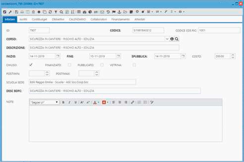 Gestione corsi: il gestionale consente operazioni relative alla progettazione corsuale, gestione delle presenze, stampa attestati e patentini, rilascio attestati; per quanto riguarda i docenti, permette la stampa delle lettere di incarichi, la gestione dello storico docenze e relativi compensi. Per ogni corso/edizione, permette di inserire preventivo e monitorare consuntivo con un inserimento puntuale dei costi per le voci previste per il corso standard.